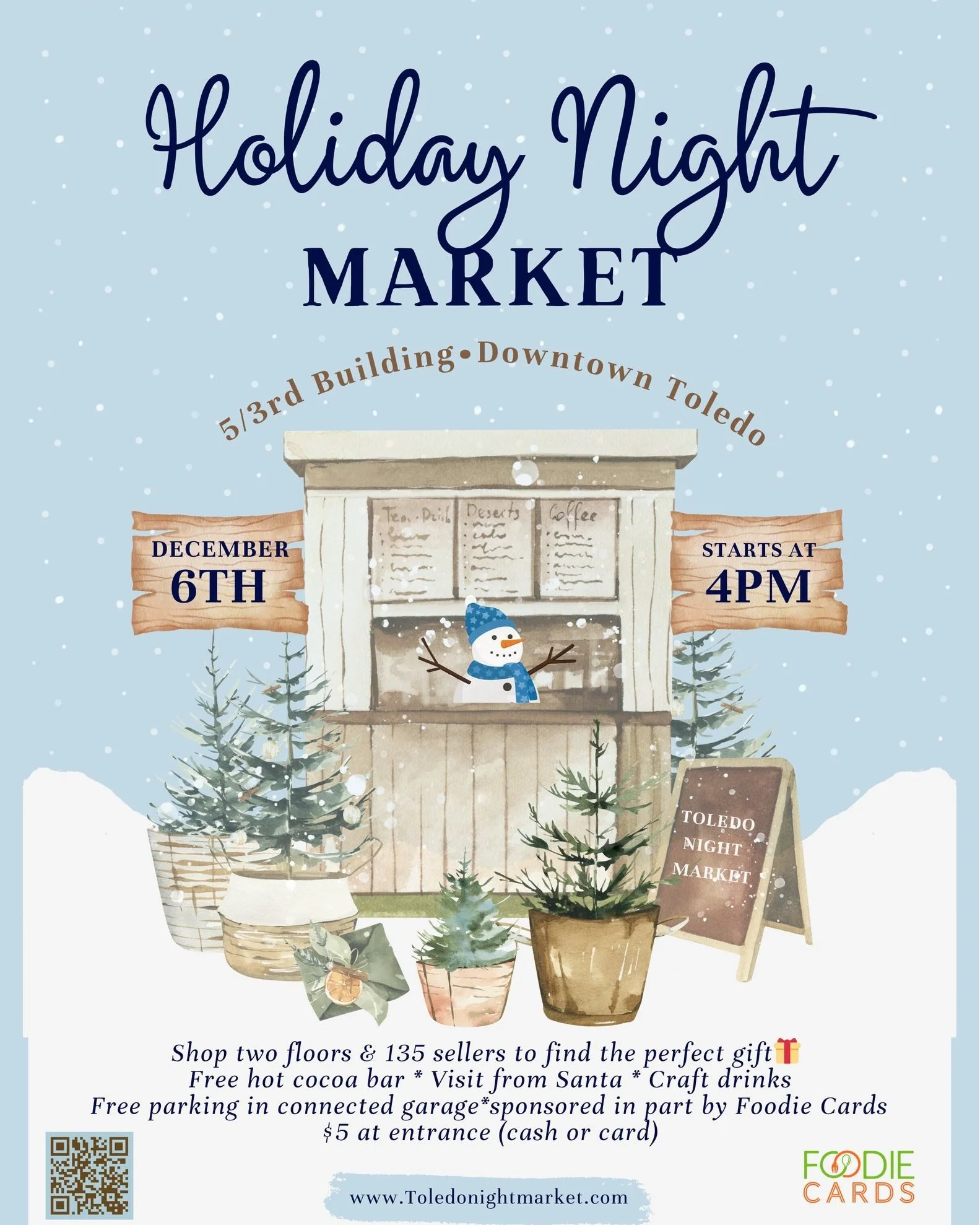 December 6 from 4pm-10pmCelebrate the season at the Holiday Night Market - presented by Toledo Night Market! We’re turning the Grand Lobby of the Fifth Third Building into a nostalgic, two-level wonderland. Ride the escalator for that classic department-store feel and explore local artisans, one-of-a-kind gifts, tasty bites, craft drinks, music, and a whole lot of holiday cheer.