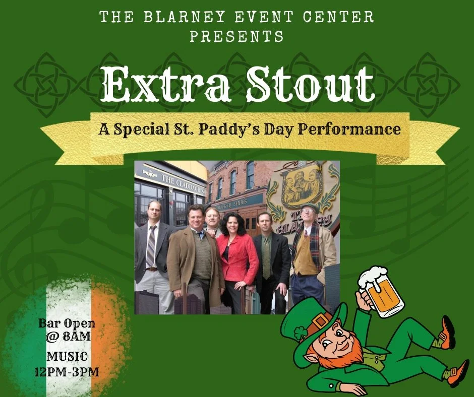 Warehouse DistrictThe Blarney Event Center proudly presents Extra Stout on Saint Patrick’s Day from 12-3 PM! Catch some real deal Celtic/Irish music. NO Cover charge either. That’s right it’s a Free show!